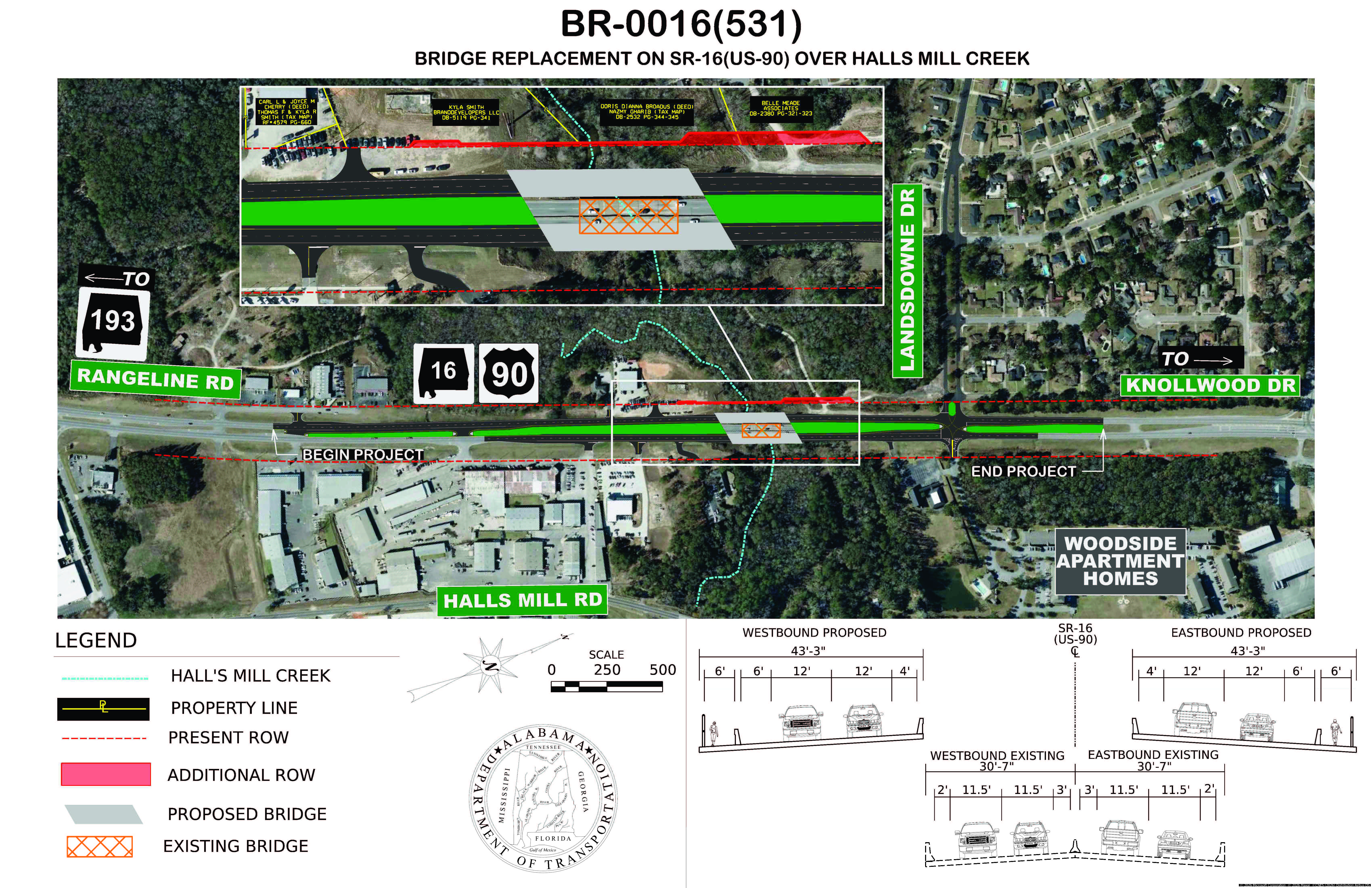 The proposed project area is located on SR-16 (US-90) over Hall’s Mill Creek. SR-16 is an urban four-lane principal arterial that runs east-west in Mobile County through a flat terrain between Mobile and Tillmans Corner. The existing bridge is approximately 0.9 miles east of the intersection of SR-16 (US-90) and SR-193 in Tillmans Corner. Adjacent to the project are several businesses on the west side of the proposed bridge and a neighborhood, church, and apartment complex on the east side.